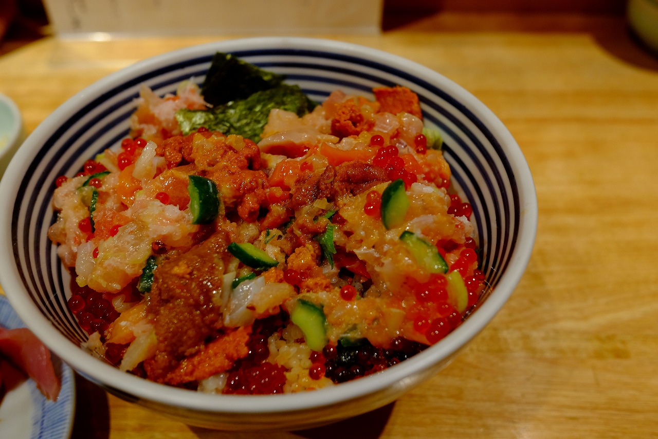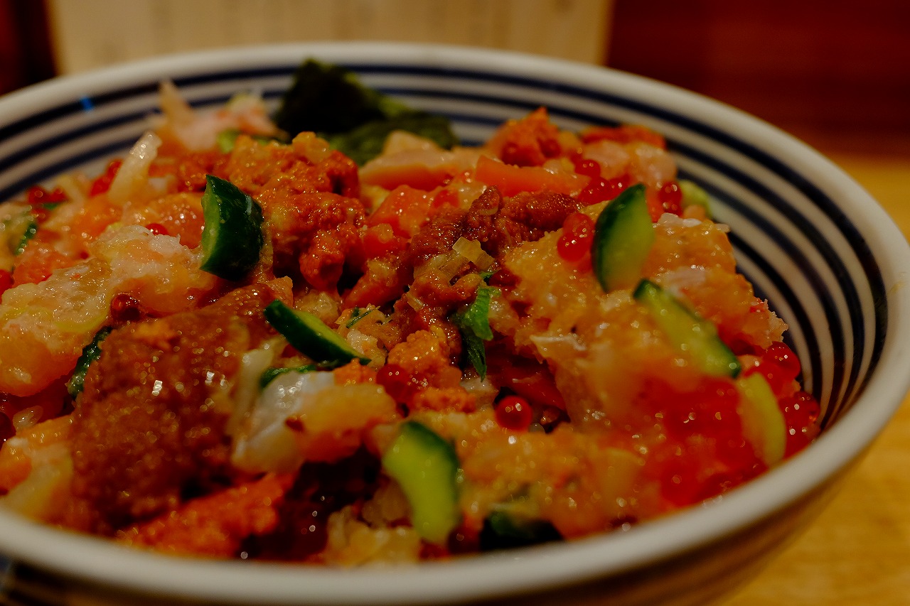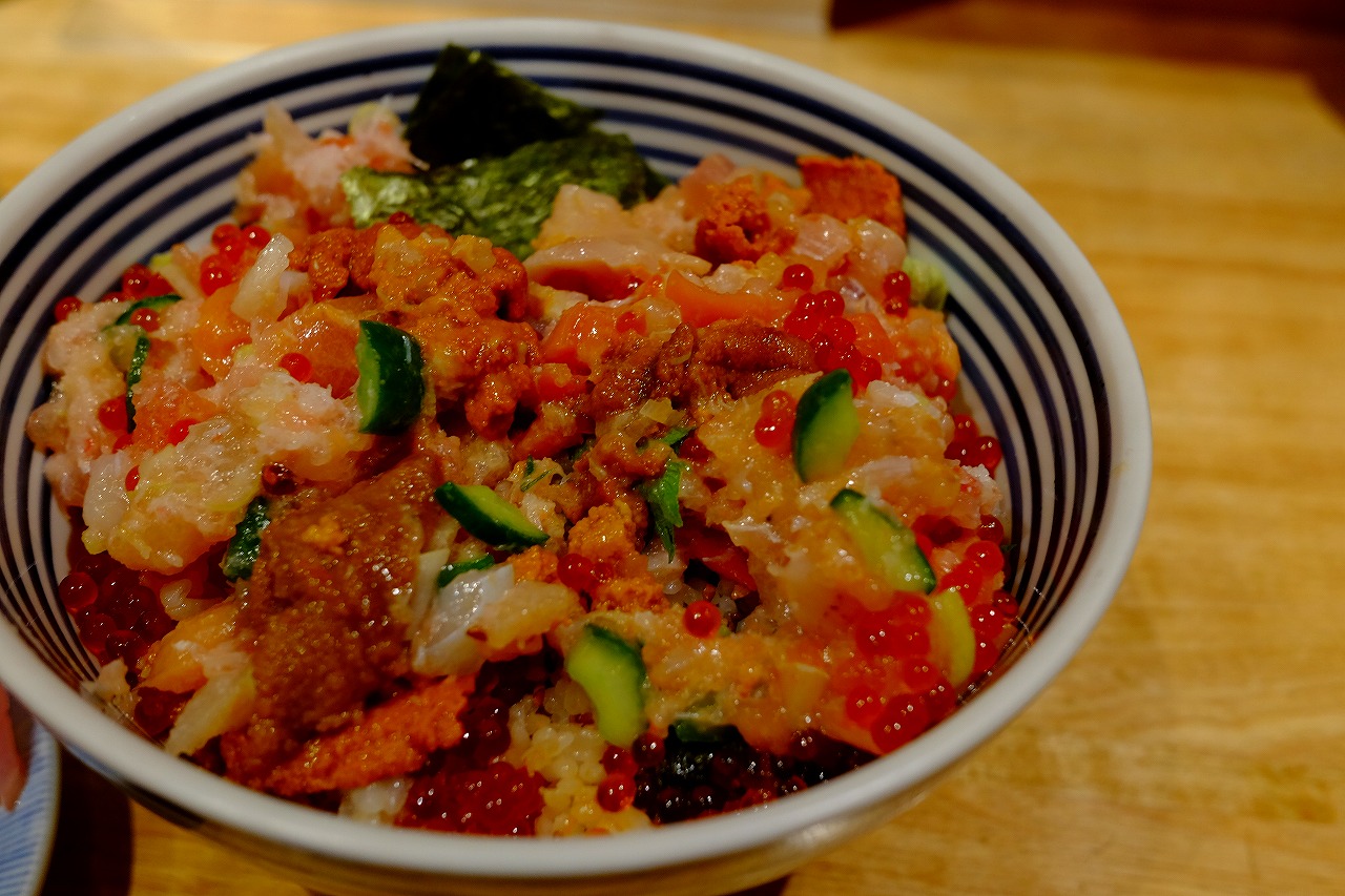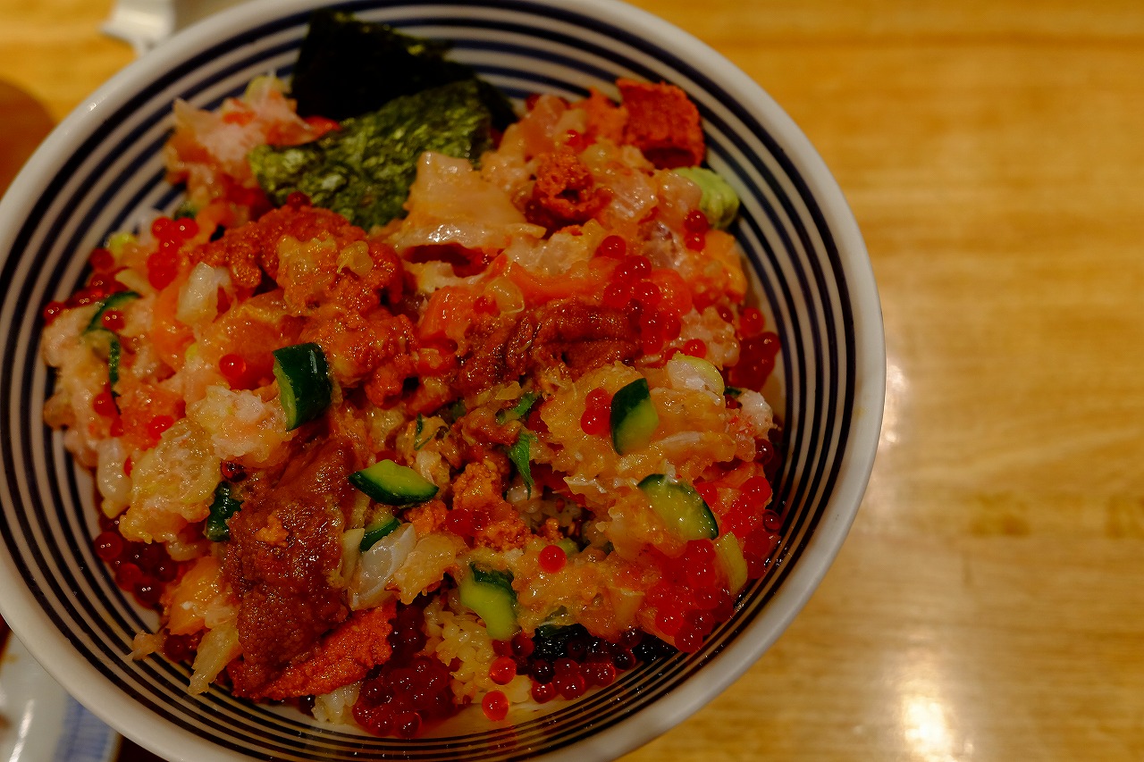 マグロ、イカ、エビ、カズノコ、ツブ貝、ミル貝に特上はいくら増し増し、雲丹増し、蟹増しのどんぶり。