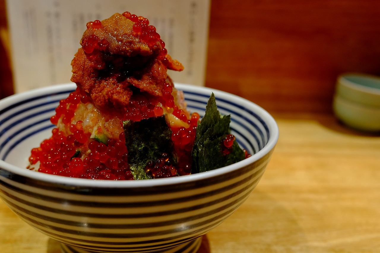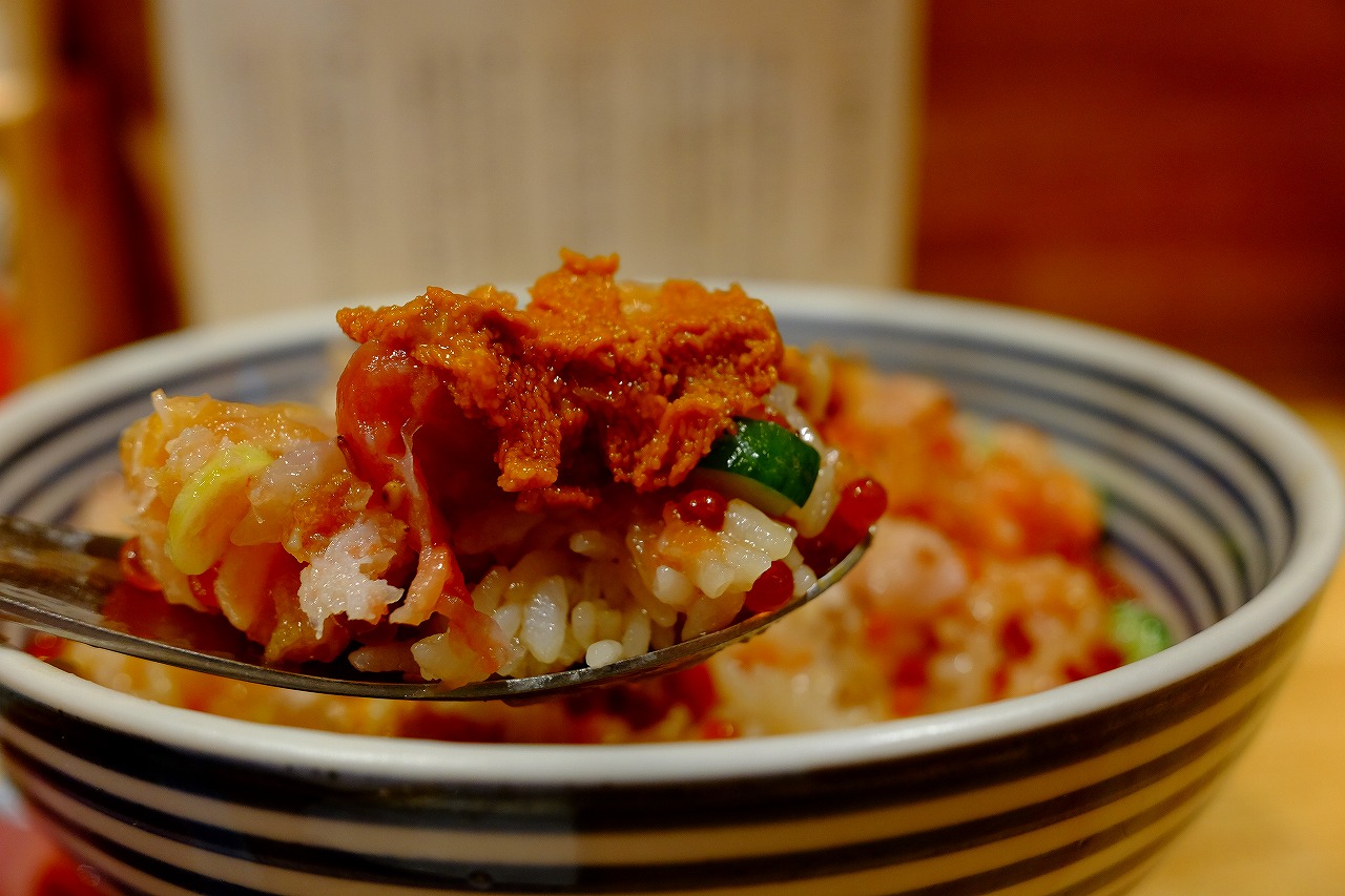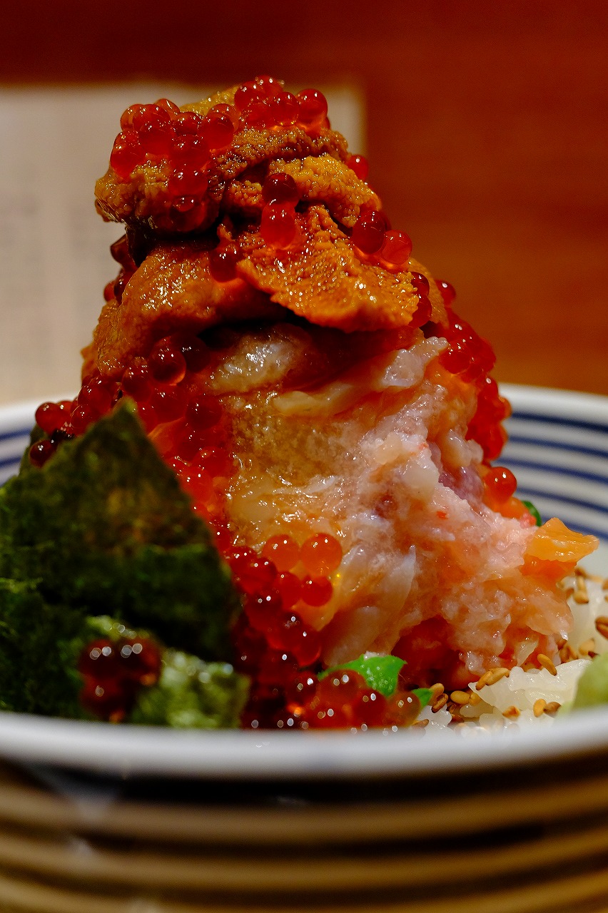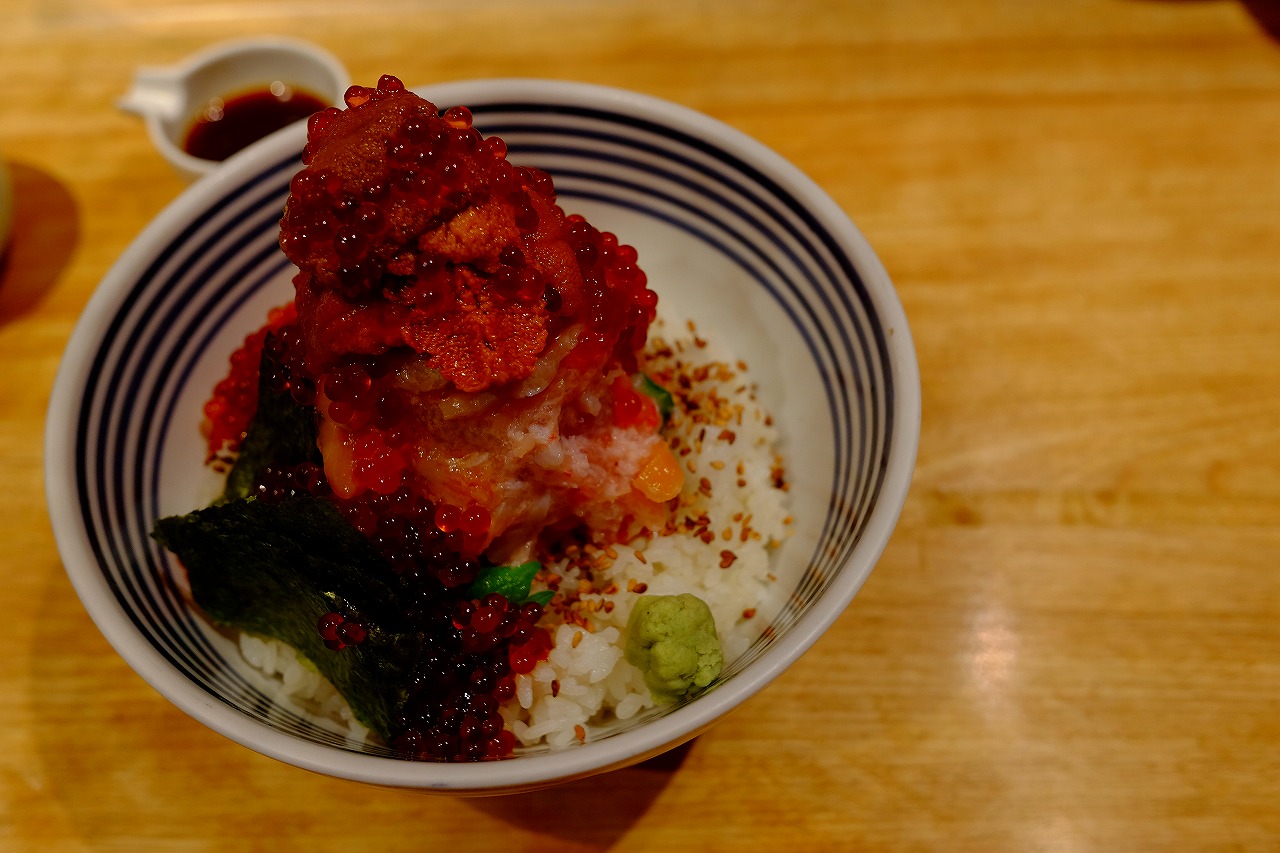 マグロ、イカ、エビ、カズノコ、ツブ貝、ミル貝に特上はいくら増し増し、雲丹増し、蟹増しのどんぶり。