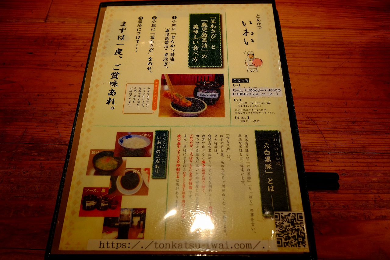 名物である、茎ワサビと鹿児島醤油でいただくとんかつの食べ方も記載されています。