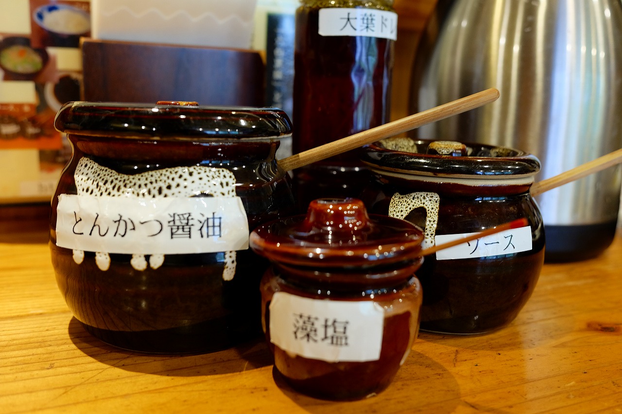 名物の茎わさびととんかつ用鹿児島醤油でいただくと、わさびの爽やかさと甘めの醤油が、衣の脂をさっぱりさせ、ご飯ともよく合います。個人的には食べ方は「①とんかつ醤油 → ②塩 → ③ソース」の順が好みです。