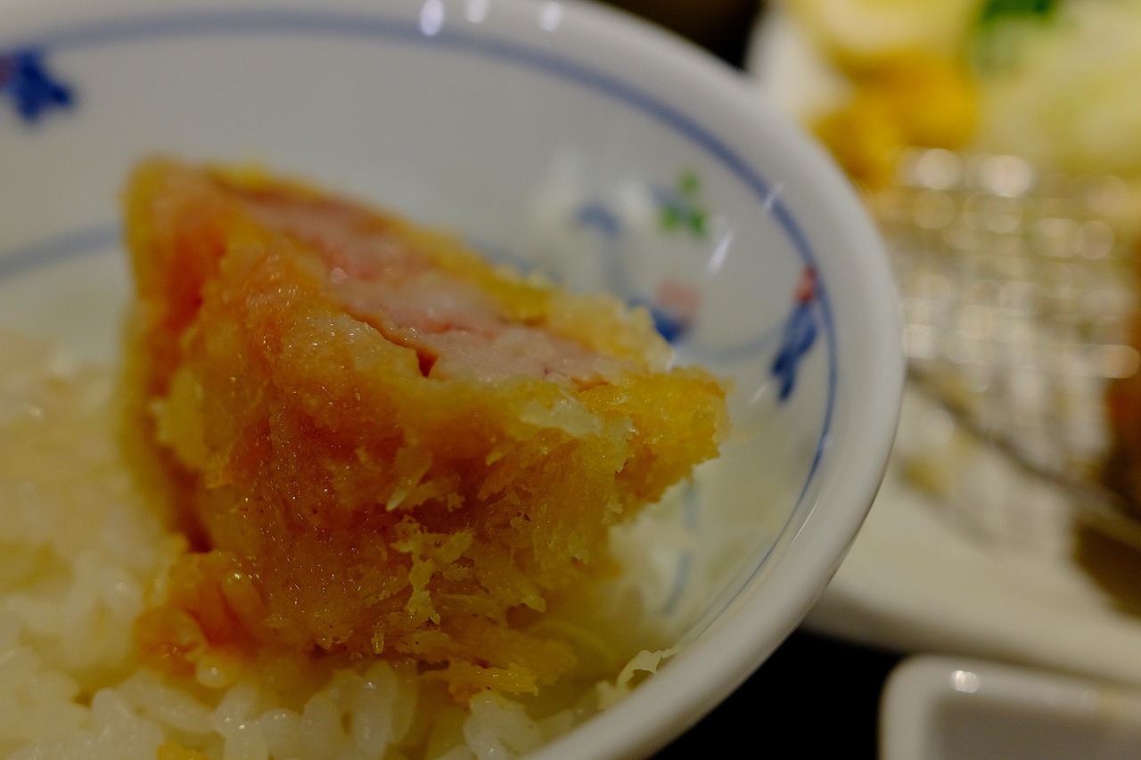 低温でじっくり揚げられた鹿児島 六白黒豚はとてもジューシーで脂も甘く、鹿児島醤油で食べてもよし、塩で食べてもよし、ソースで食べてもよしの素晴らしいとんかつです。