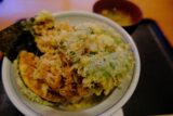 海老、かき揚げ、ピーマン、サツマイモ がのった小天丼。