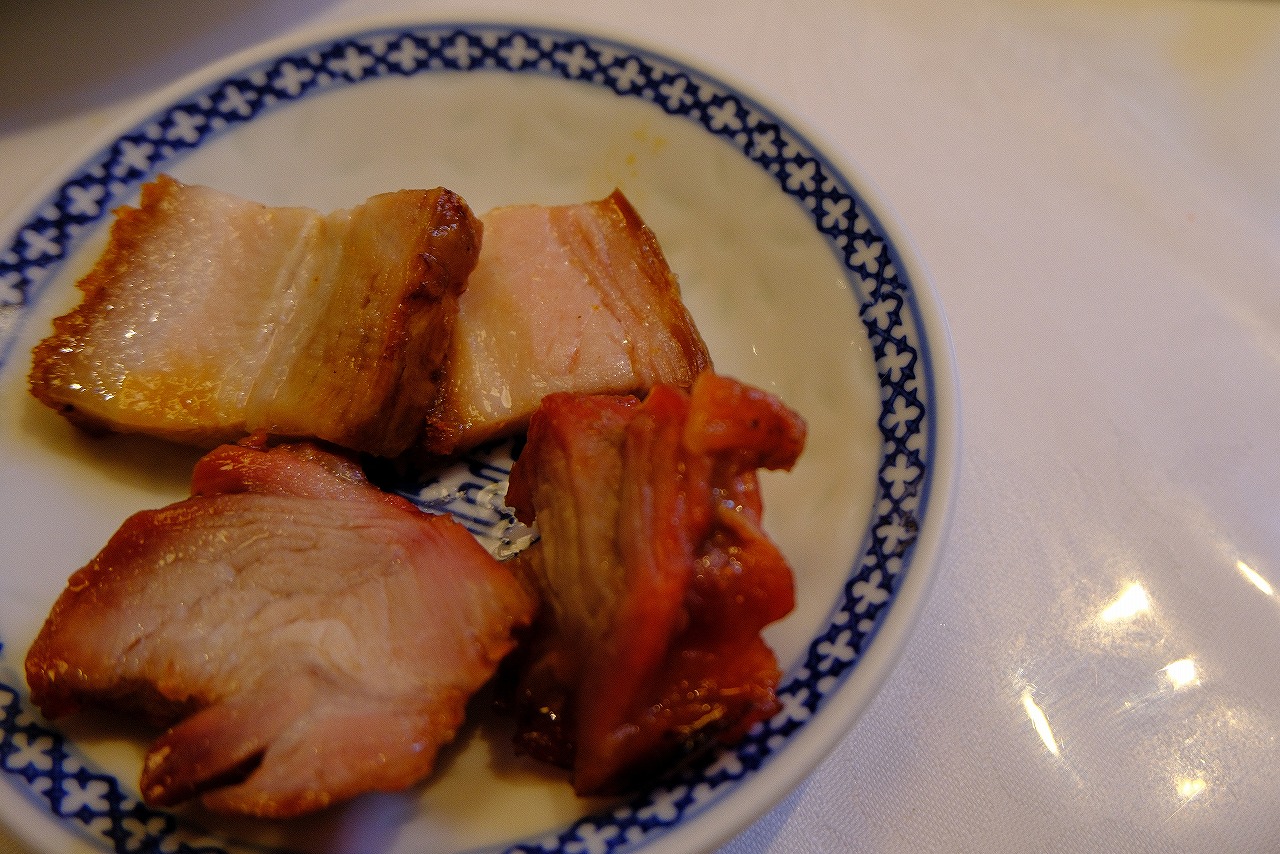 皮付き豚バラ肉は皮がパリパリに焼かれていて、皮の食感と豚バラ肉の甘みがとても良い。