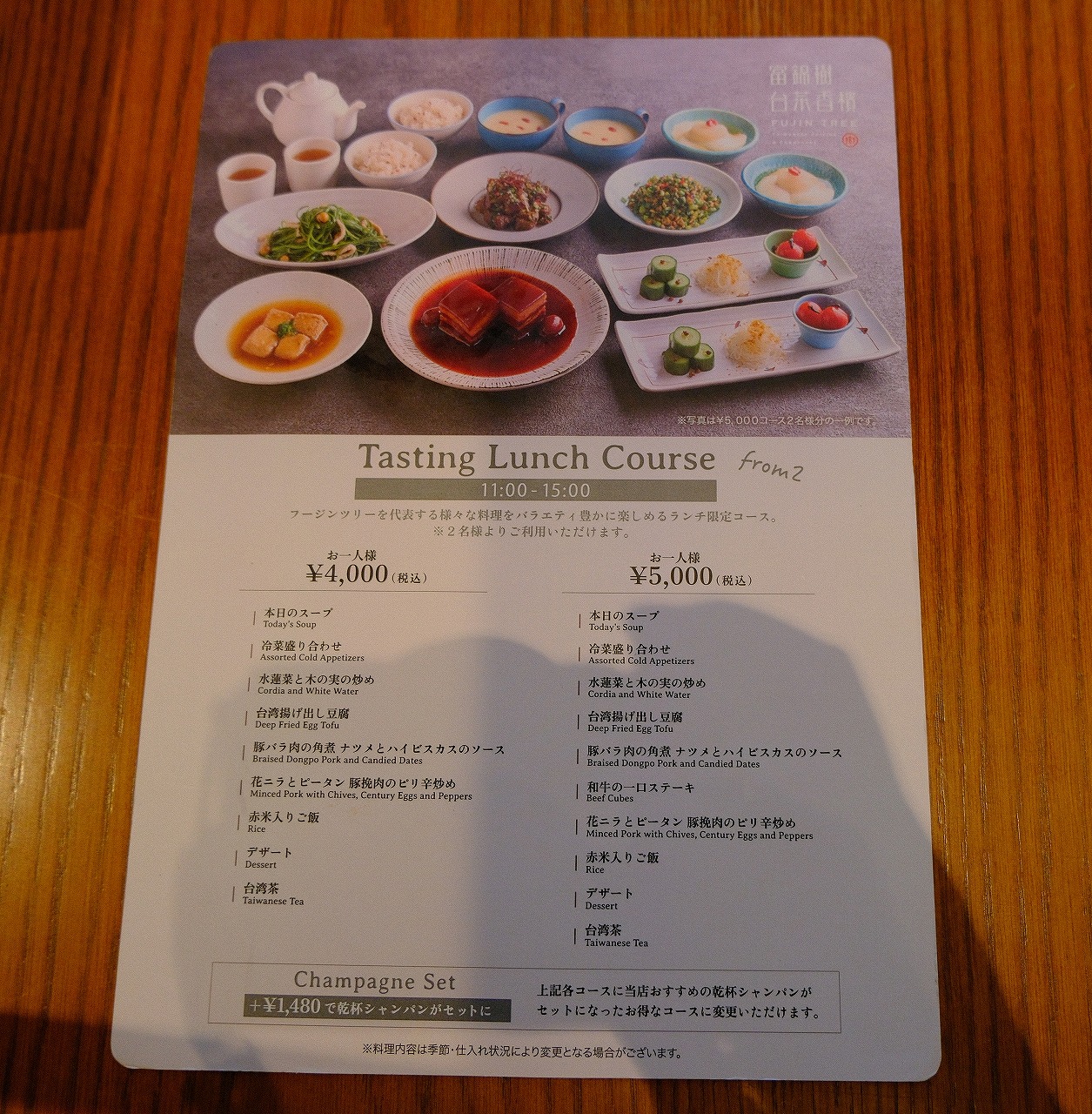 フージンツリーの代表的な料理はいただけますし、量もすごく多い訳でもなく、アラカルトを注文すると一品、一品が多くなる事などを考えると、1人でもテイスティングコース2人前を注文するのがいいと思います。