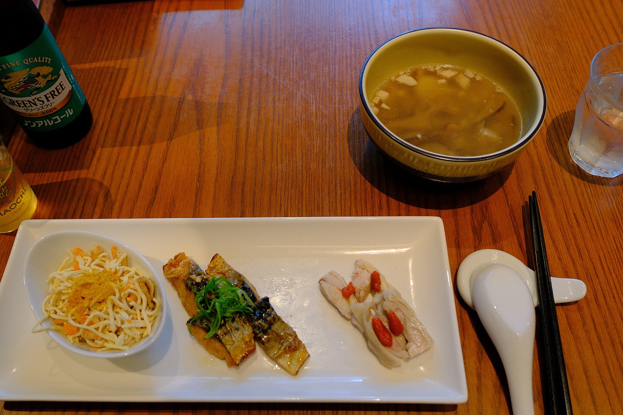 干し豆腐の麺、鯖のマリネ、鶏のチャーシューの冷菜。