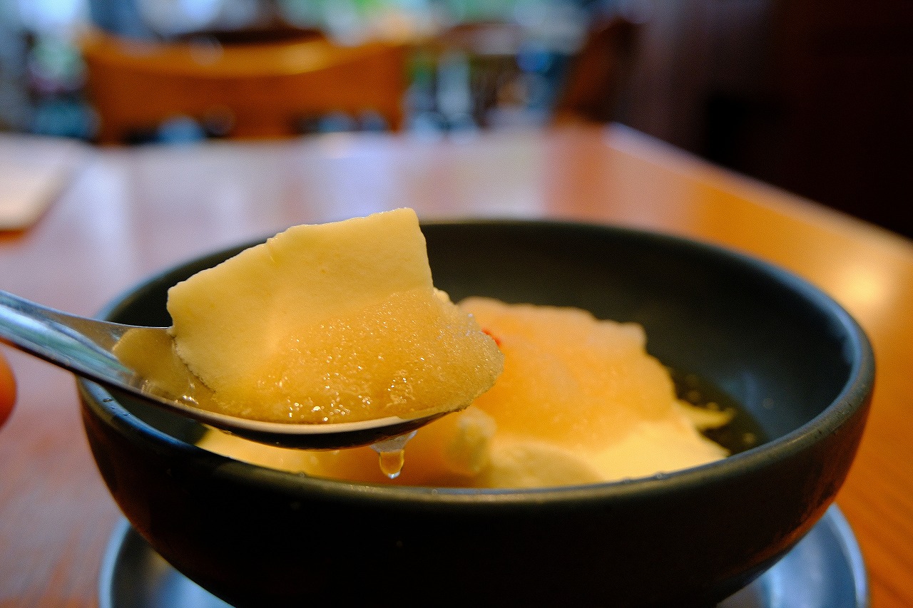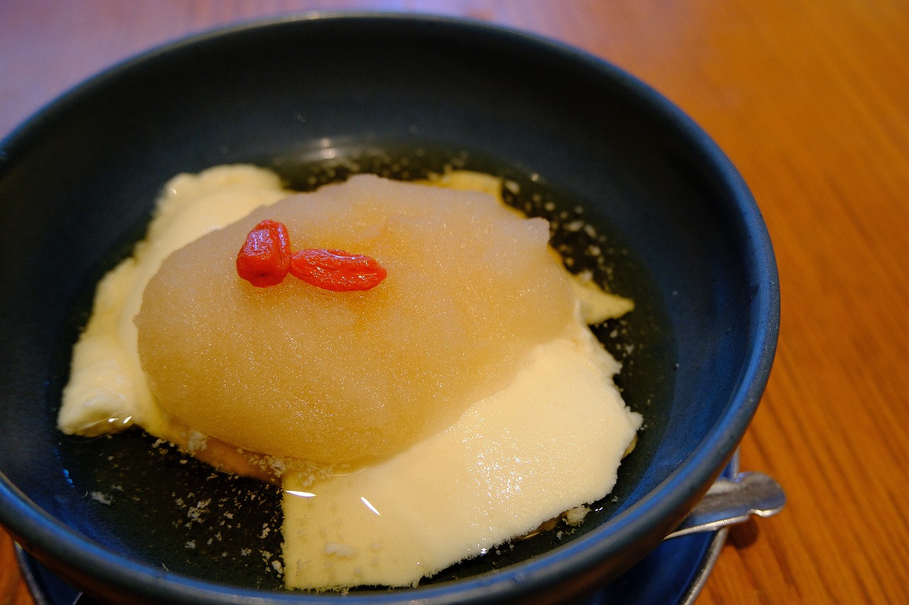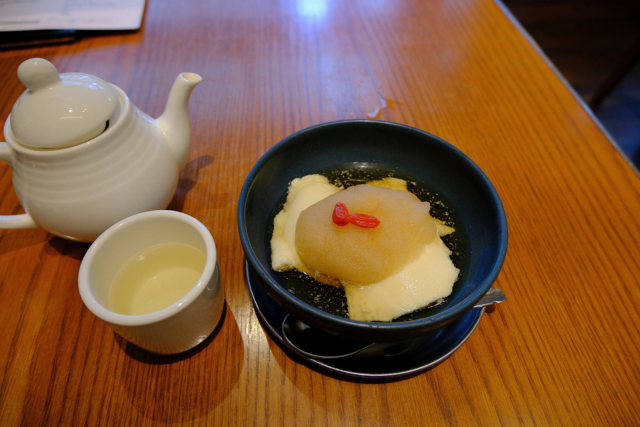 デザートは豆花(トウファ)です。豆乳を固めて作る「豆腐プリン」でシロップをかけていただきます。この日はりんごのシャーベットも添えられていました。