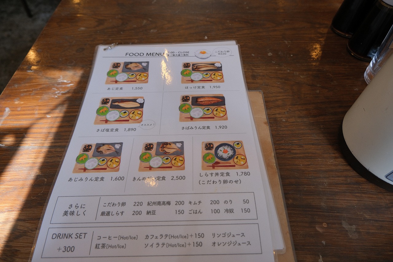 朝7時から営業しており、朝食メニュー(干物定食等)は9時までの注文が可能で、定休日は火曜日(木曜定休とする案内も)です。