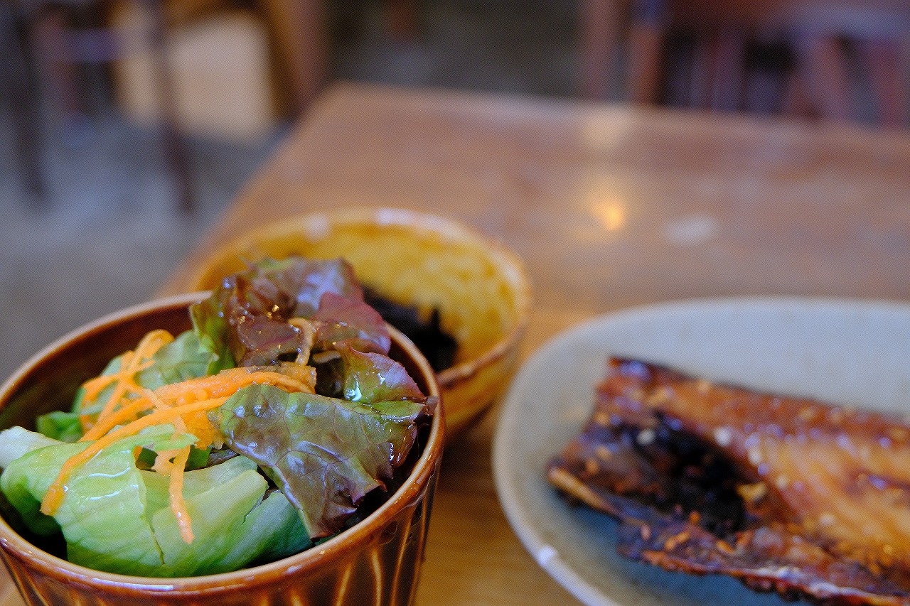 サラダはさっぱり味の和風ドレッシング、その他、味醂干しの鯖とひじきがついた定食です。