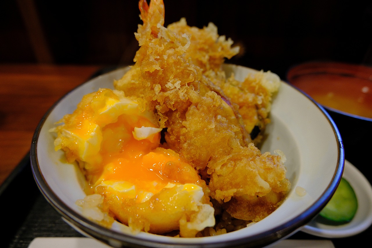 半熟玉子をつぶしていただくと、玉子のまろやかさと甘めのドンだれのハーモニーがとても美味しい天丼でした。