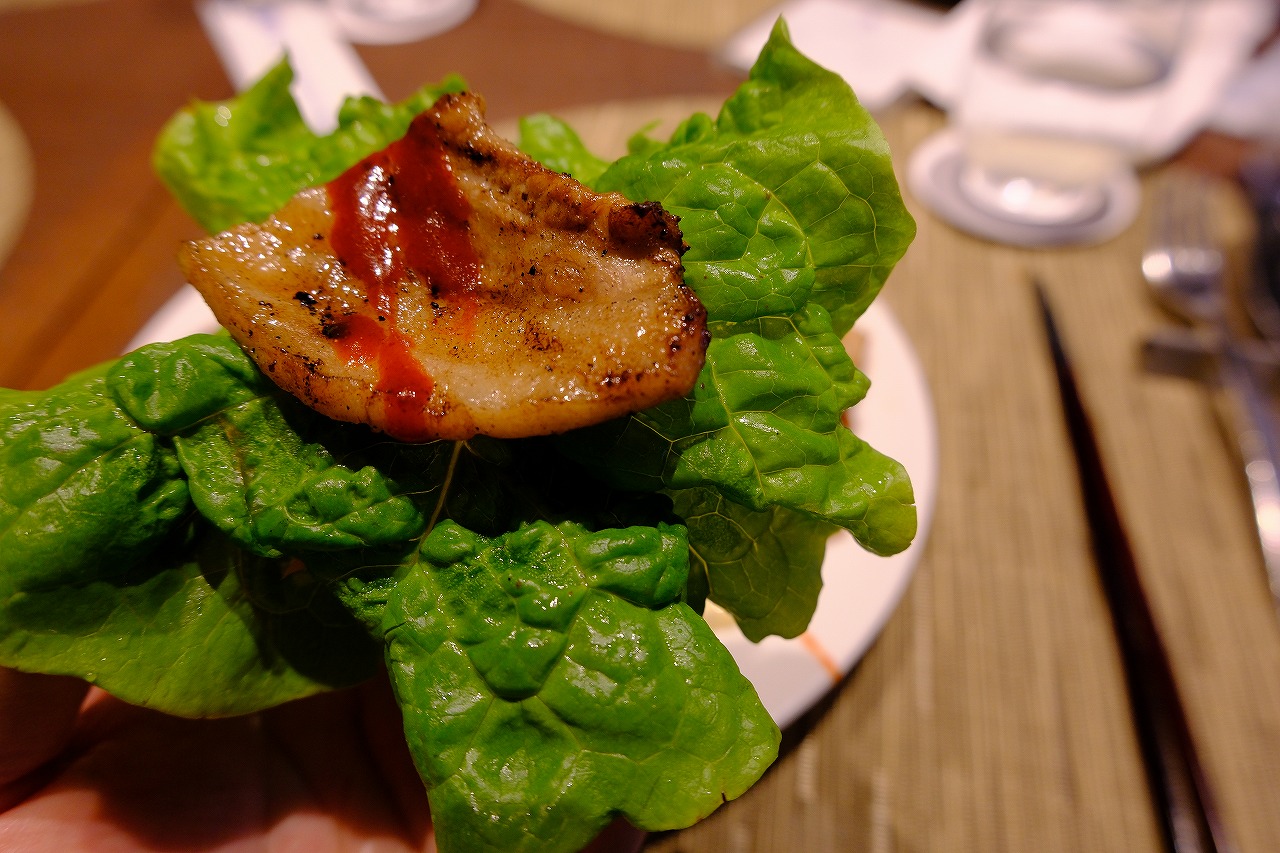 イベリコ豚の脂の甘みとグリル感を楽しめる一皿、サムギョプサルもグリル感がとてもよい。