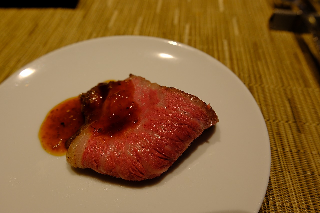 A4,5の様な滑らかな舌触りの牛肉、噛むとしっかりと肉の旨味を感じる事ができる。トリュフソースでいただきたい。