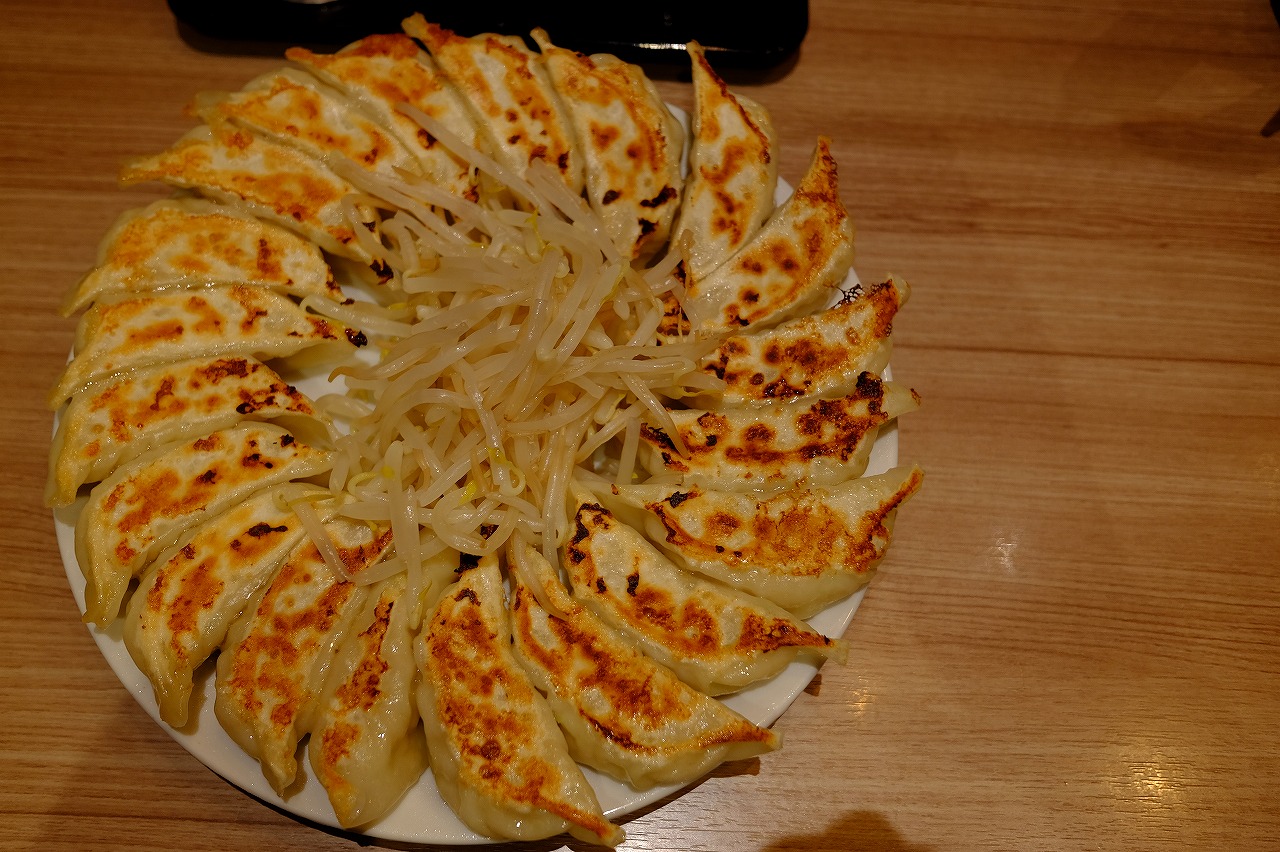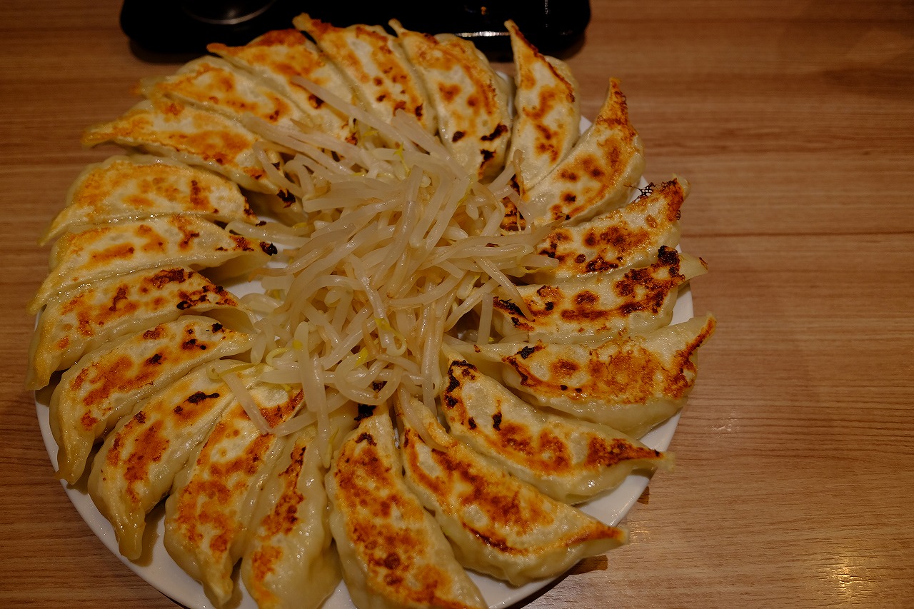 餃子20個が円形に盛り付けられており、真ん中に茹でもやしが添えられた浜松餃子。