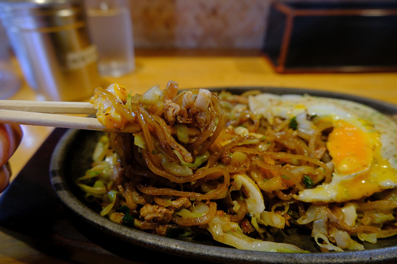 細かく切られたキャベツにこしある麺、桜えび、イカ、豚肉も強火で炒められて食感よく、さらに水分が適度に飛んでおり素材の甘さを感じました。