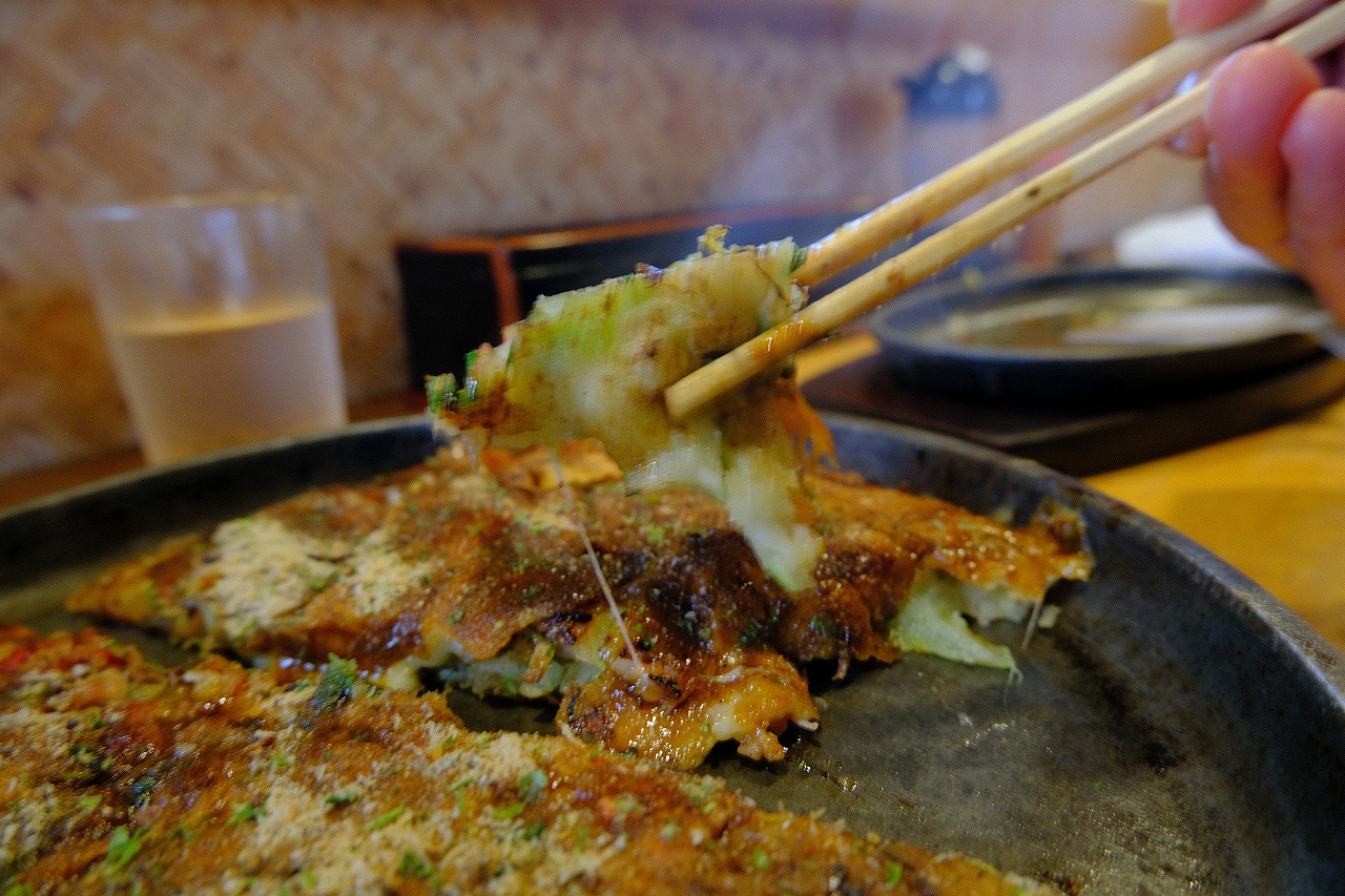熱々の鉄板により残る水分も飛んでさらに具材の甘さが引き立つ。